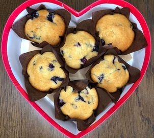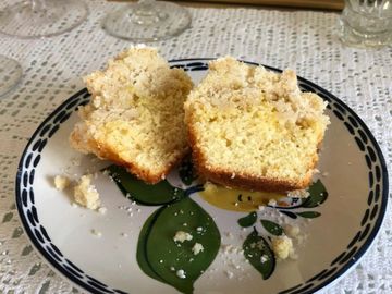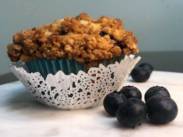 A batch (12) of our lemon muffins, topped with a layer of lemon curd, covered in a lemon zest streusel topping .