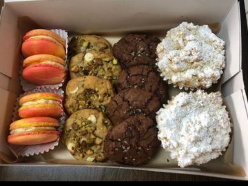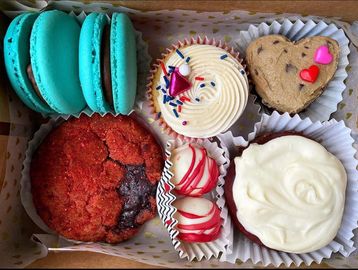 Hazelnut Macarons, Salted Caramel Cupcake, Espresso CCCookie Dough Brownie, Dark Chocolate Strawberry Cookie, Rose Almond Truffles, Red Velvet Cinnamon Roll