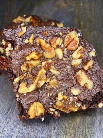 Gooey brownies packed with toasted walnuts. The brownies are made with Dutch cocoa for rich chocolate taste and the nuts are optional.
